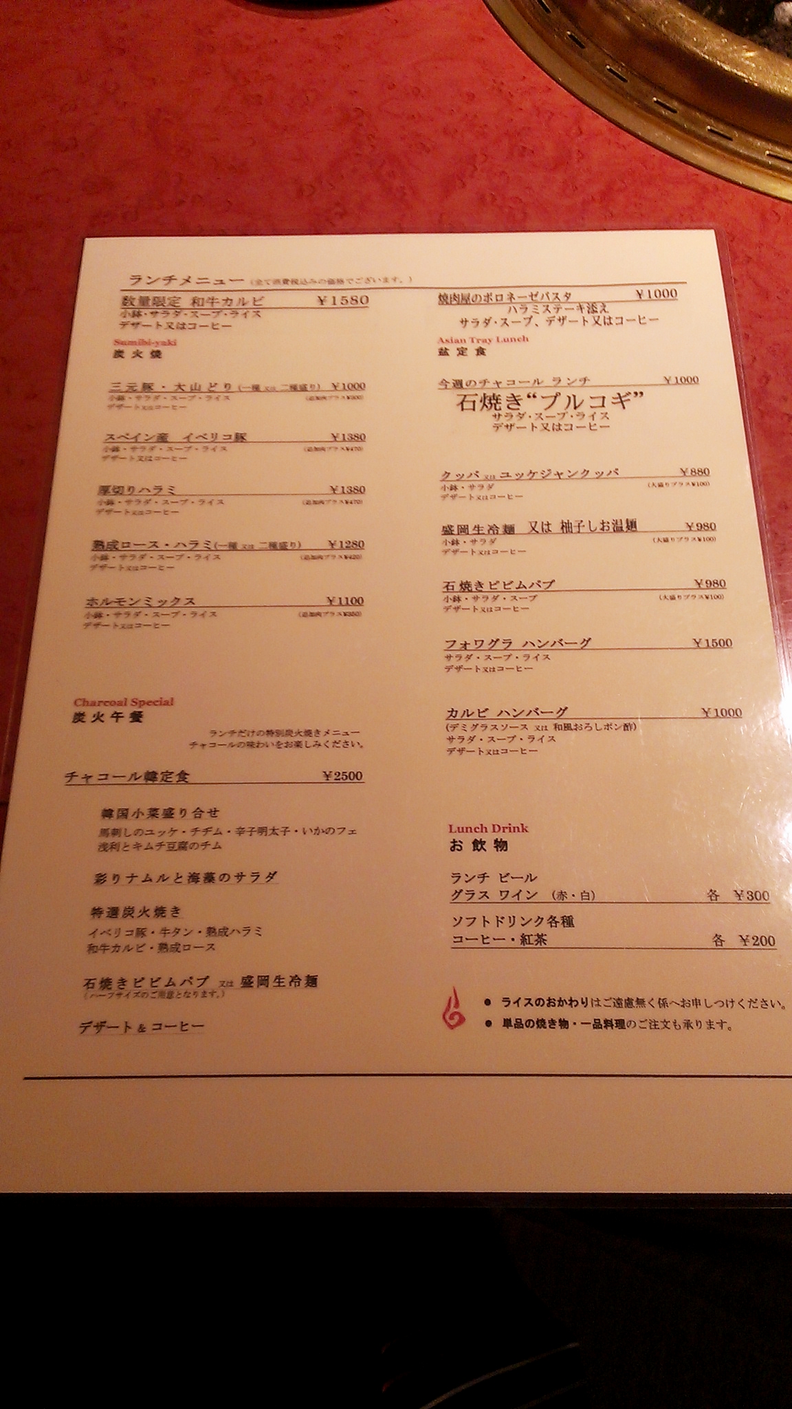 少し早かったためか、個室に通してもらいました。メニューは焼き肉を中心として色々あります。